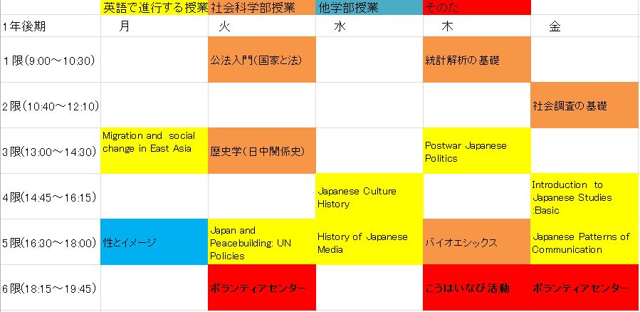 *時間割表を見て、「え?英語や第二外国語の授業がない、なぜ?」と思っている人がいるでしょう。私は社会科学部の新しくできたプログラムの学生で、多くの専攻授業は英語で進行します。そのため英語の授業や第二外国語の授業は履修していません。早稲田大学では近年グローバル化を目指し、一部の学部(政治経済学部、社会科学部、理工学部、国際教養学部)で、英語で進行する授業をスタートしました。