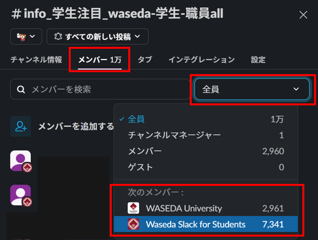 「次のメンバー:」として、【WASEDA University】の他に表示されているものがチャンネルに接続している外部オーガナイゼーションおよび当該外部オーガナイゼーションから参加している外部メンバーです。