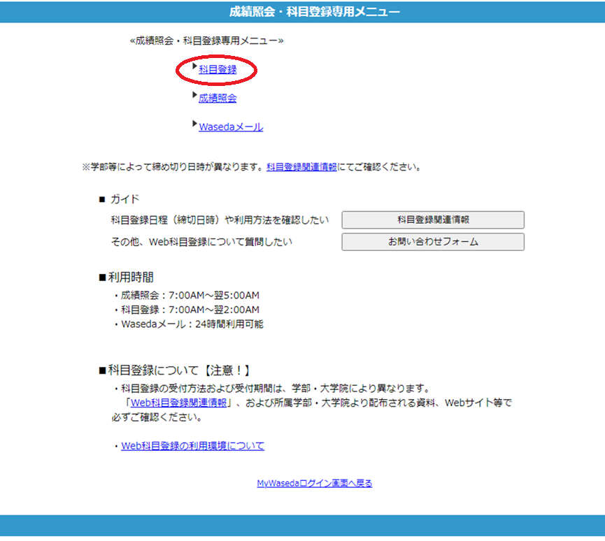1. My WASEDAのログイン画面左下に表示されている「成績照会・科目登録専用」のボタンをクリックします。