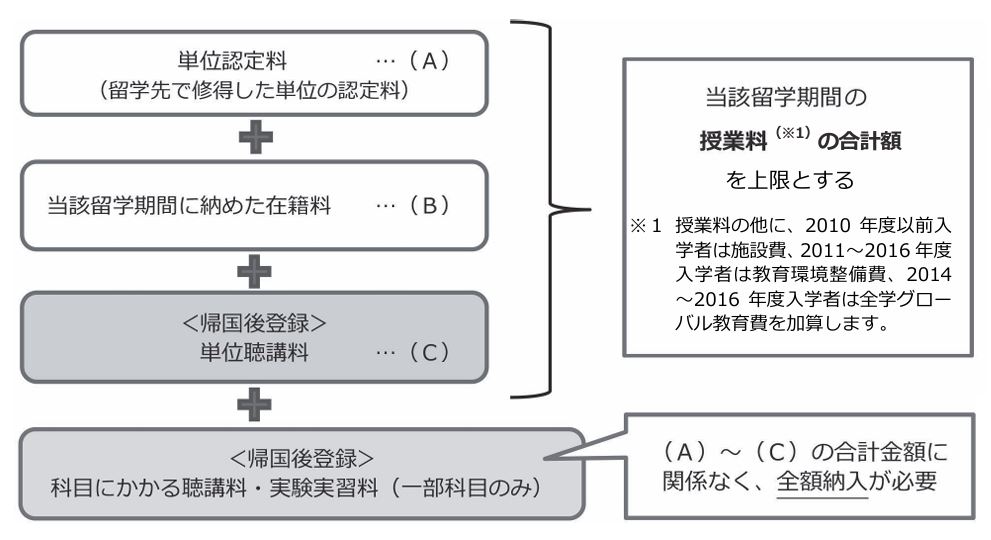 「単位認定料(A)、当該留学期間に納めた在籍料(B)および単位聴講料(C)の合計額は、履修単位数および認定単位数にかかわらず、当該留学期間の授業料、施設費(2010年度以前入学者)、教育環境整備費(2012~2016年度入学者)、全学グローバル教育費(2014~2016年度入学者)の合計額を上限とする。」