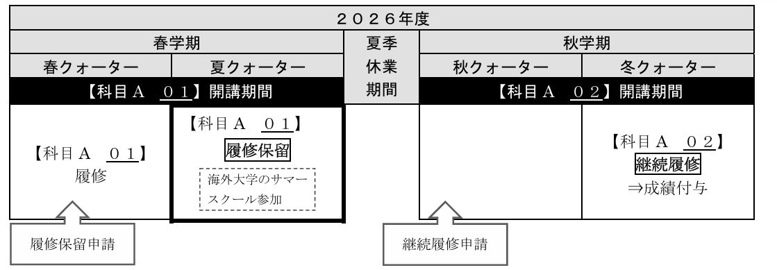 [例2] 2026年度春学期開講の【科目A(01クラス)】を履修保留し、2027年度秋学期開講の【科目A(02クラス)】を継続履修する場合