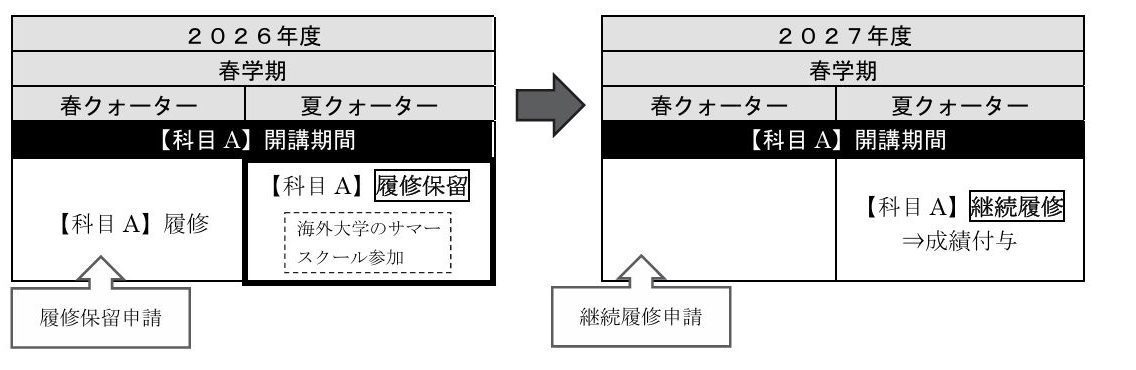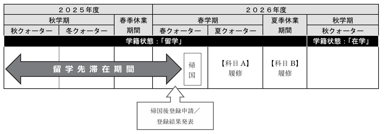 [例] 2026年度秋学期~2027年度春学期に留学し、帰国後登録により2027年度夏クォーター科目(【科目A】)および夏季集中科目(【科目B】)を履修する場合