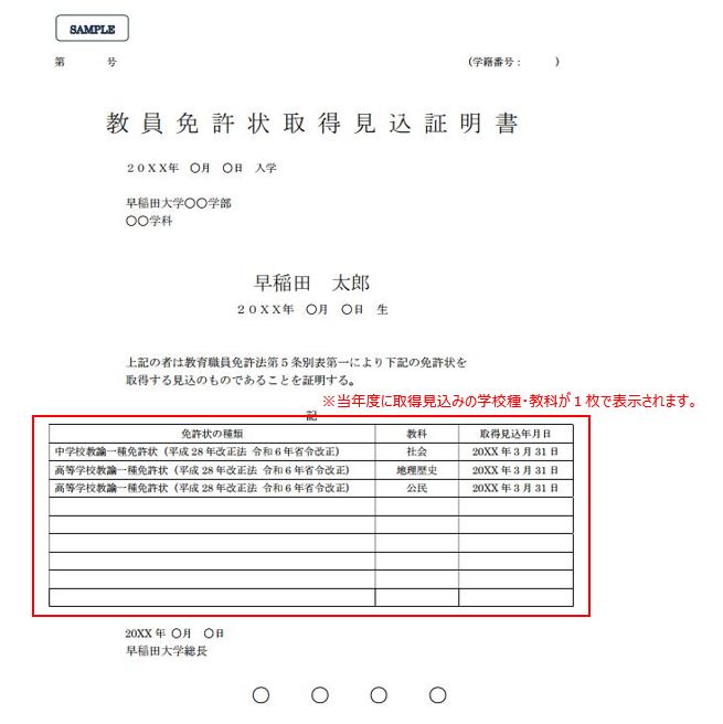 なお、本証明書は1通に当年度取得見込の学校種・教科が表示・証明されます。