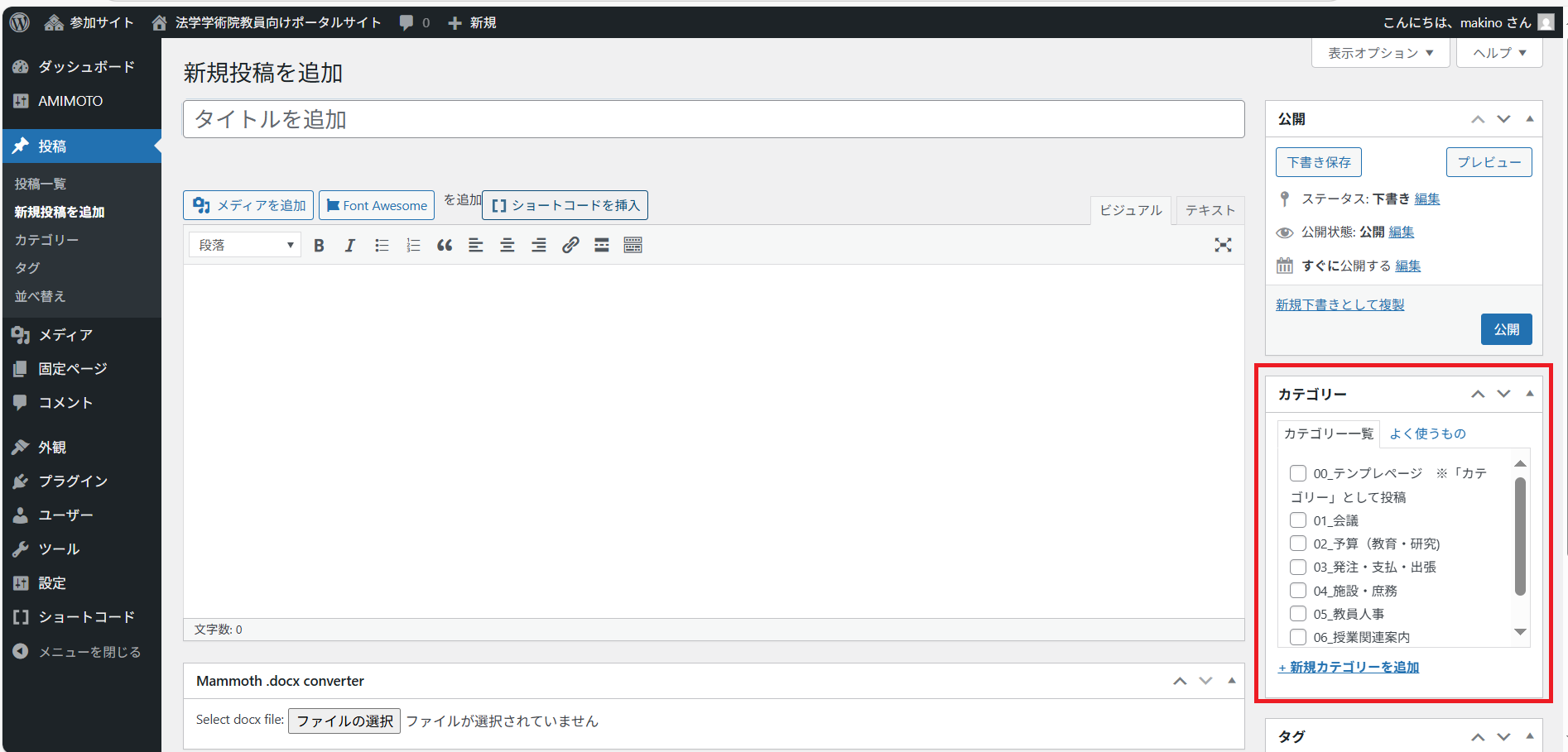 中身の編集が終わったら、ページ右側の「カテゴリー」を必ず一つ選択したうえで「更新」を押してください。