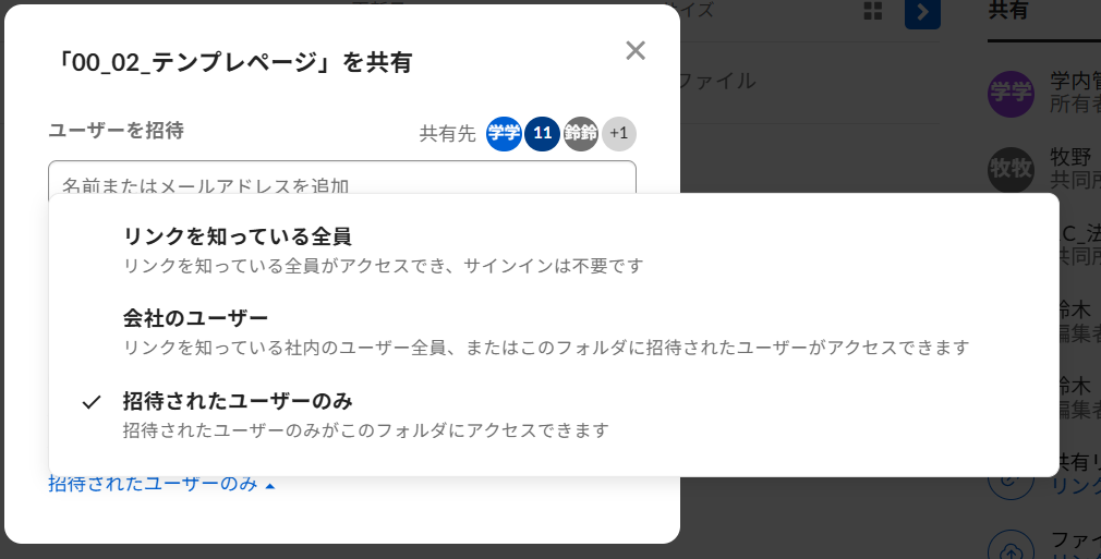 注意!! 全教員向けpublic shareで共有リンクを作成する場合は、リンク設定を「招待されたユーザーのみ」に必ず変更してください。