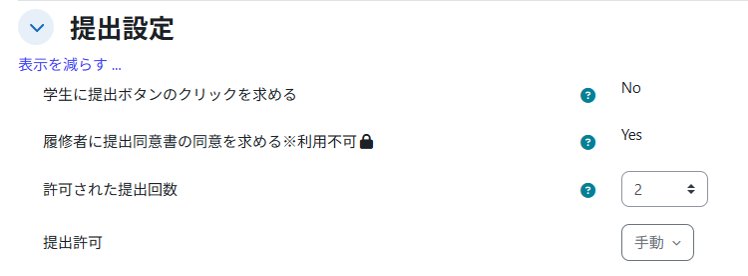 - 「提出タイプ」では、テキスト入力による提出を許可するのか、ファイルのアップロードによる提出を許可するのかを設定します。「最大アップロードファイル数」では、提出できるファイル数の上限を、「最大提出サイズ」では、提出できるファイルのサイズ上限を設定します。