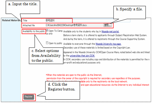 Note that any related materials registered in the Edit Syllabus window are automatically uploaded to the Course Edit window of Course N@vi, so that they can be published to the students taking the course just like course outlines.