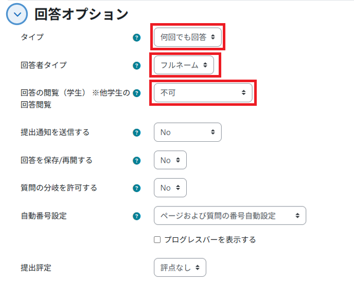 - ・If you set “Type” to “respond many”, then the student’s second and subsequent responses will be treated as new responses (and will not overwrite the first).