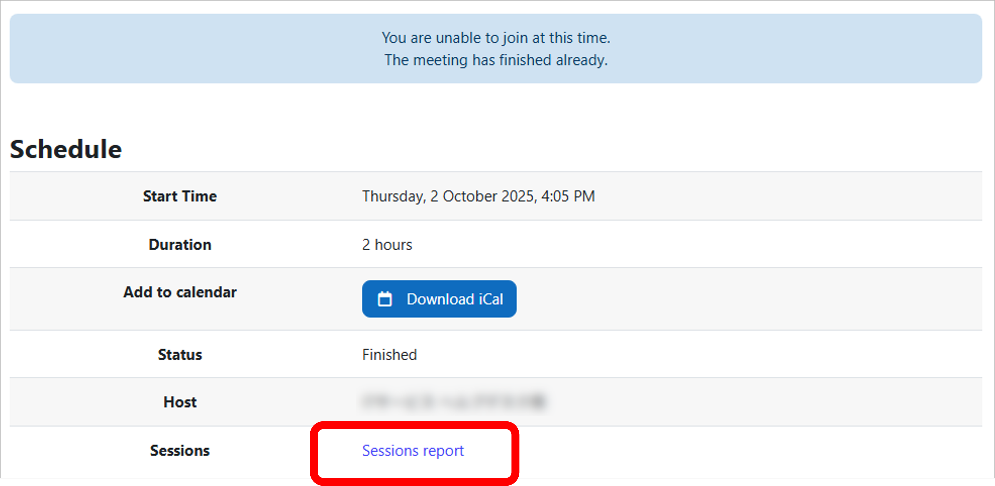 - The session information will be displayed and it will display “You are unable to join at this time”. Click on the “Sessions report” link.