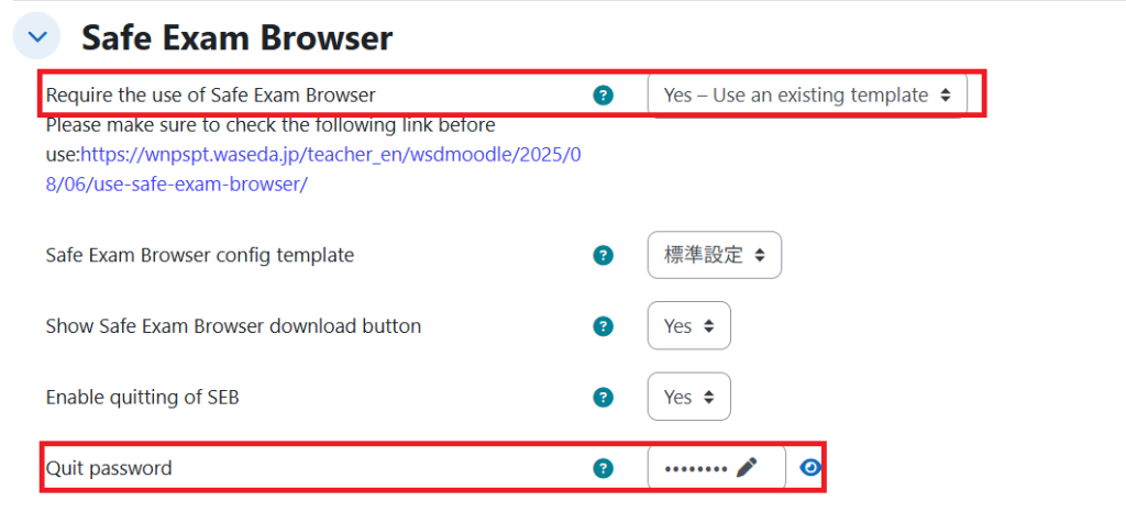 To use SEB for quizzes in Waseda Moodle, simply configure the settings in the quiz setup screen. Instructions for configuration are provided later.