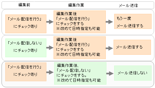 - 「掲載期間」のみが修正された場合は、メール配信設定が「メール配信を行なう」であっても、メールの送信は行ないません。