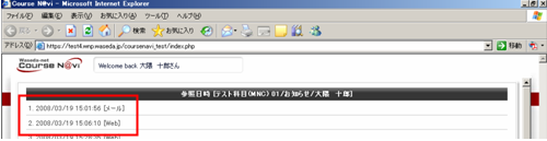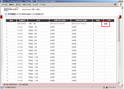 [詳細]リンクをクリックすると、履修者がいつ、どのような手段で(メールか、Webか)参照したかを確認できます。