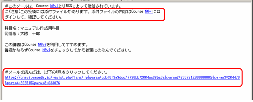 メールには画像・添付ファイルは添付されません。お知らせにファイルが添付されている場合はCourse N@viにログインして確認します。