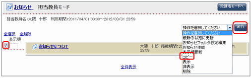 - [お知らせ]一覧から、コピーをする[お知らせ]のチェックボックスにチェックを入れます。操作メニューから[コピー]を選択し、をクリックします。
