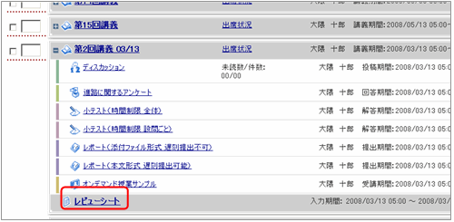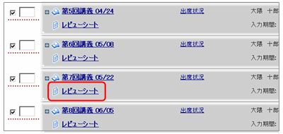 - [講義一覧]画面の[レビューシート]リンクを直接クリックすることで、各講義のレビューシート画面に遷移することも可能です。