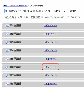 - レビューシート管理画面が表示されます。参照したい講義の[レビューシート]をクリックします。