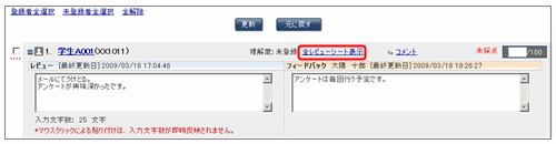 レビューシート画面で履修者名の右側にある「全レビューシート表示」をクリックすると、対象履修者のレビューシート一覧を表示することが可能です。