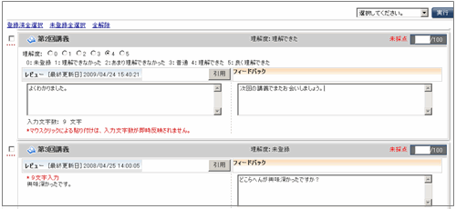 各講義における感想や理解度を履修者が入力します。教員はそれを参照し、コメントを登録することができます。