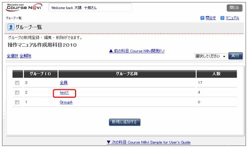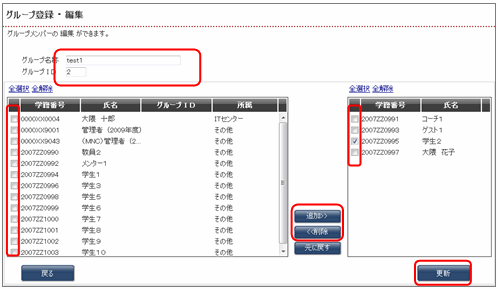 メンバーを追加する場合は左の欄をチェックしてを、削除する場合は右の欄をチェックしてをクリックします。グループ名称、グループIDの変更も行うことができます。修正が終了したら、をクリックします。