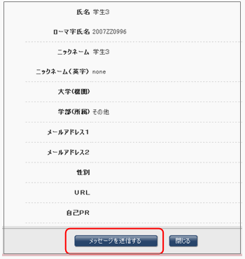 私書箱メッセージではプロフィール画面から任意の履修者にメッセージを送信することができます。メールアドレスを管理したり、いちいち確認して打ちこむ必要がありません。またメールアドレスを公開することなくメッセージを送ることができます。履修者に連絡をとる手段としてご活用ください。