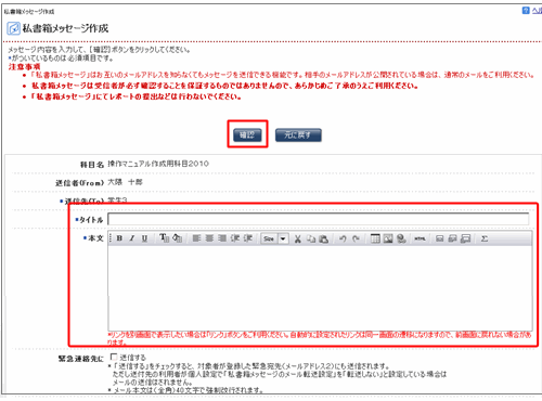 - 私書箱メッセージ作成画面が開きます。タイトル及び本文を入力し、をクリックします。