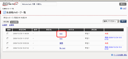 - [科目一覧]画面で、[私書箱]をクリックすると、[メッセージ一覧]が表示されます。[メッセージ一覧]をクリックします。