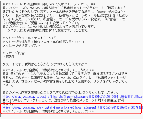 - 私書箱メッセージがCourse N@viのプロフィールのメールアドレス1で設定されているメールアドレスに転送されます。転送されるメールの最下部のURLをクリックしてください。