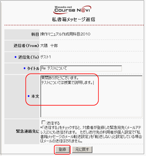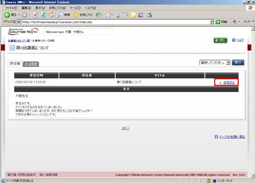 - [返信する]をクリックすると、メッセージに返事を書くことができます。
