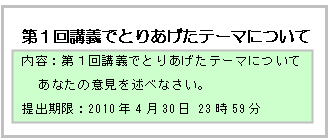 | 提出期間 | 履修者が、レポートを提出できる期間を指定 | 指定しない場合は、講義フォルダの利用期間と同様です。
