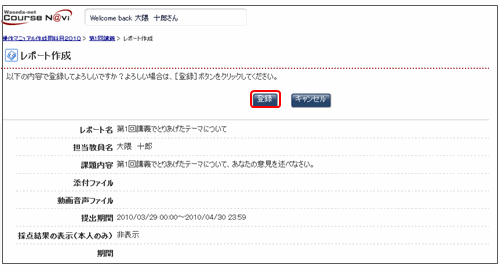 - 「レポート名称」に【第1回講義でとりあげたテーマについて】を入力します。