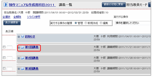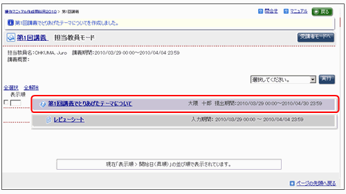 - 講義一覧画面で、レポートを作成する講義フォルダをクリックします。