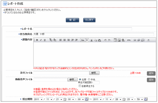 | レポート提出方法 | レポートの提出方法を指定。 | 「指定なし」、「添付のみ」、「本文のみ」を選択することができます。