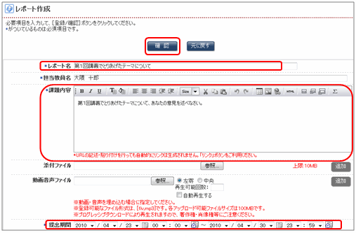 「提出期限」に【2010年4月30日 23時59分】を設定します。