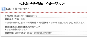 | お知らせへの登録 | レポートをお知らせで連絡 | 「課題内容」に入力した内容をお知らせ本文として登録します。 ダイレクトリンクの表示 「表示する」「表示しない」を選択することができます。 ダイレクトリンクの表示を「表示する」にするとお知らせのメールに、直接提出を行なうためのURLが添付できます。