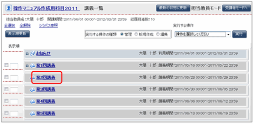 - [講義一覧]画面で、資料コンテンツを格納する予定の講義フォルダ名をクリックします。
