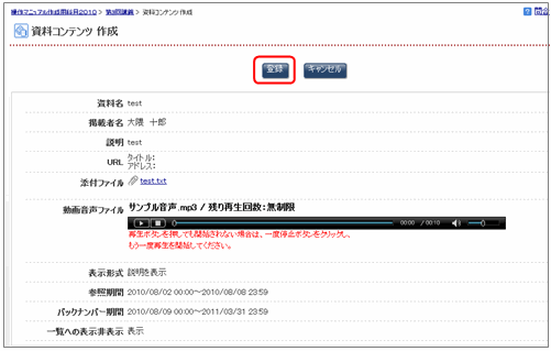 | 動画音声ファイル | 資料として参照する動画ファイルまたは音声ファイルがある場合に指定 | ボタンをクリックし、添付するファイルを指定します。複数のファイルを添付したいときはボタンをクリックしてさらにファイルを指定します。 表示する位置、再生可能回数、自動再生するか否かを設定できます。