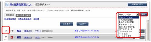 | 削除(未解答にする) | 対象となる解答者にチェックをいれます。 | 解答が削除されます。履修者は「未解答」の状態になります。 |