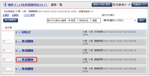 - 講義一覧画面から、アンケートを作成する講義フォルダをクリックします。