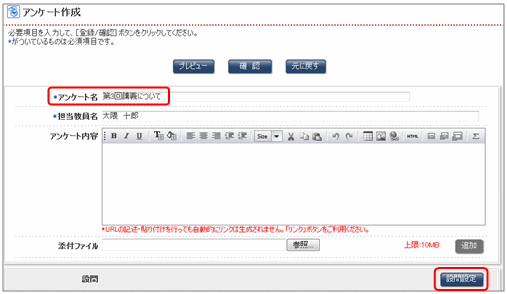 「アンケート名」を入力します。設問を設定します。をクリックします。