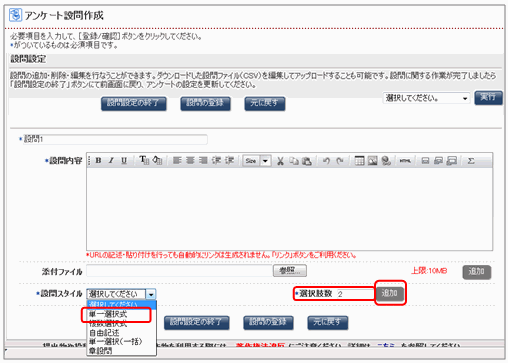 設問スタイルで「単一選択(一括)」を選択すると選択肢を入力できるようになります。