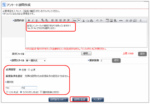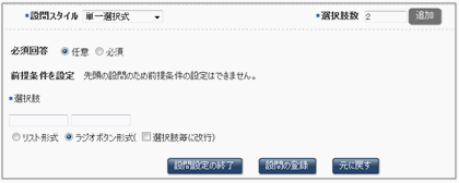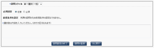 - 設問内容を入力し、必須解答欄から[任意]か[必須]のどちらかを選択します。選択肢を入力し、[リスト形式]、[ラジオボタン形式]のいずれかを選択します。