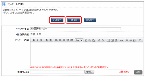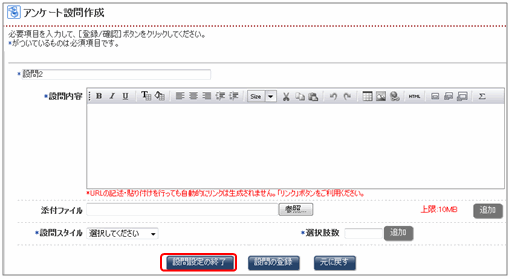 | 添付ファイル | 設問内容に参考となるファイルを添付する場合に指定 | をクリックし、添付するファイルを指定します。複数のファイルを添付したいときはをクリックしてさらにファイルを指定します。 |