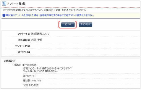 | お知らせへの登録 | 「アンケート内容」に入力した内容をお知らせ本文として登録 | アンケートを掲載したことがお知らせとして登録されます。 メール配信を行うかどうかを指定することができます。 ダイレクトリンクの表示 「表示する」「表示しない」を選択することができます。 ダイレクトリンクの表示を「表示する」にするとお知らせのメールに、直接回答を行なうためのURLが添付できます。