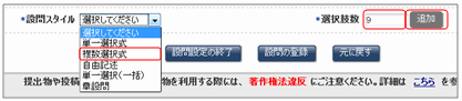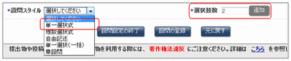 | 設問スタイル | 設問の形式を選択 | [単一選択式]:複数の選択肢から解答をひとつ選ばせる形式。 [複数選択式]:複数の選択肢から解答を複数選ばせる形式。 [自由記述]:自由に解答を記述させる形式。 [単一選択式(一括)]:複数の選択肢から解答をひとつ選ばせる形式。 [章設問]:子設問を作成できる。  |