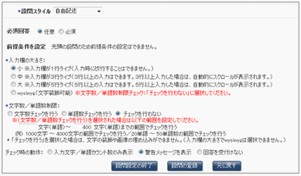- 入力欄の大きさ:大、中、小を選択することができます。Wysiwygを選択した場合、回答欄で文字の修飾が可能になります。