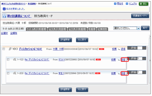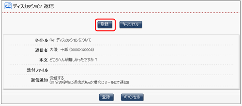 - ディスカッション記事一覧画面の[返信]をクリックします。