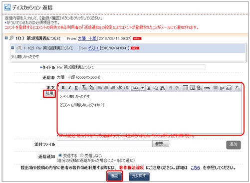 - ディスカッション返信画面が表示されます。タイトル、コメント内容を本文に入力し、をクリックします。