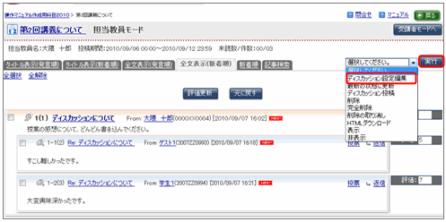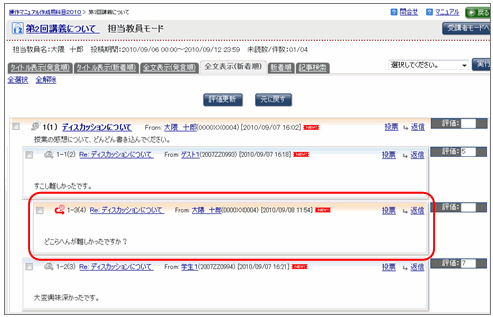- 別画面でディスカッション記事の作成、変更を行うため、操作のリストボックスから[最新状態に更新]を選択し、実行しないと返信の内容が反映されません。