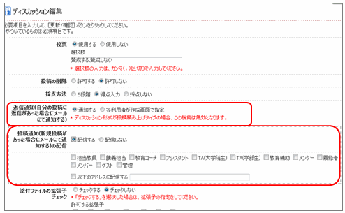 - ディスカッション編集画面において、返信通知を[通知する]、投稿通知を[配信する]に設定してください。投稿通知の場合は配信先も設定してください。