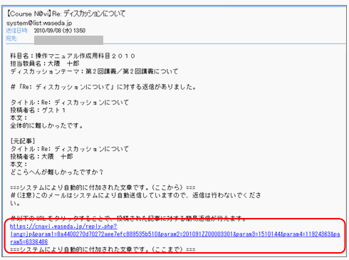 - ディスカッション記事が投稿される、または記事に返信が行われると以下のようなメールが配信されます。表示されているURLをクリックします。